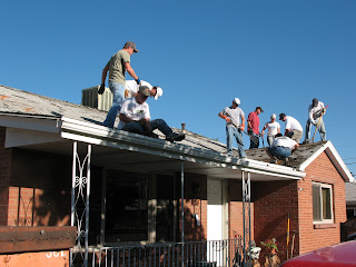 We started off the day with the paper on the front of the house and all of the back to go. At least the shingles were already here so we didn't have to wait to get started. Since this was the third day of the project we did have a super start but there were a few faithful saints who gathered to keep things moving forward.